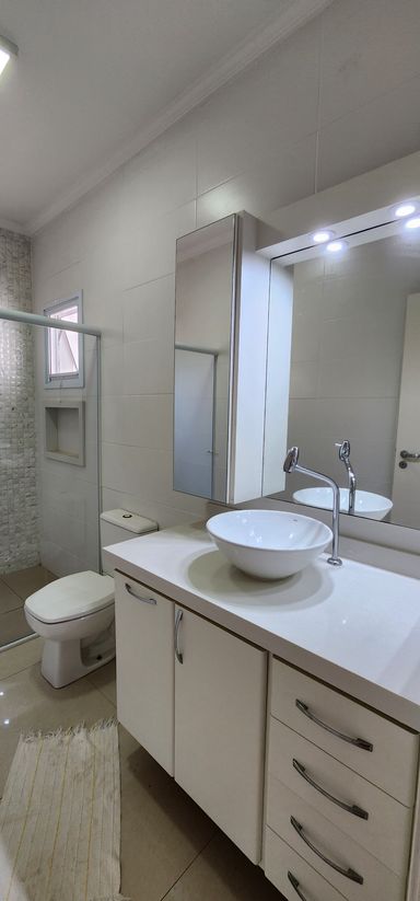 No piso inferior, a casa oferece uma ampla sala de estar e jantar, cozinha rica em armários planejados, lavanderia, 2 depósitos, 1 dormitório adicional e 1 banheiro completo, garantindo funcionalidade e excelente aproveitamento dos ambientes.