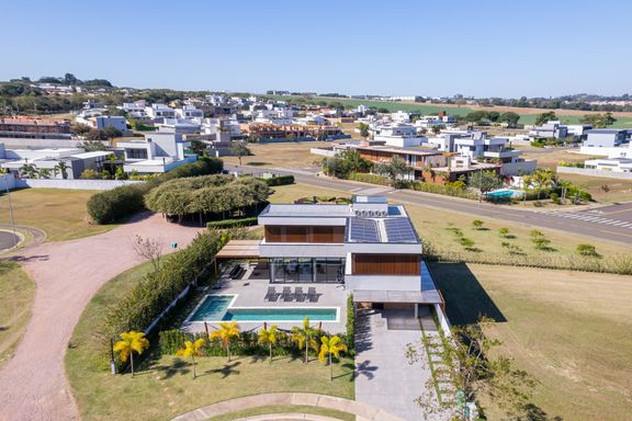Casa térrea com projeto inteligente e ambientes amplos, oferecendo conforto e praticidade em cada detalhe. São quatro dormitórios, sendo uma suíte master espaçosa e outra suíte adicional, além de dois banheiros e um lavabo. A integração entre as salas de estar e jantar com a área gourmet cria um ambiente acolhedor e ideal para receber convidados. A casa conta ainda com área de serviço, despensa e depósito, otimizando o dia a dia. Entre os diferenciais, estão o sistema de aquecimento solar para torneiras e chuveiros, pressurizador para as redes de água quente e fria, além de recirculador de água quente e aquecimento solar na piscina. Os acabamentos impressionam pelo pé-direito elevado: 3 metros nos quartos, 4 metros na garagem da área gourmet e 5,80 metros nas salas. O jardim, com grama sintética, paisagismo completo e irrigação automática, valoriza ainda mais os espaços externos. O projeto luminotécnico foi desenvolvido de forma personalizada, garantindo charme e funcionalidade. Todos os banheiros estão equipados com box, as venezianas dos dormitórios são automatizadas com controle remoto e a infraestrutura está pronta para instalação de ar-condicionado. A área externa conta com deck em vidro retrátil, proporcionando versatilidade e sofisticação ao ambiente.